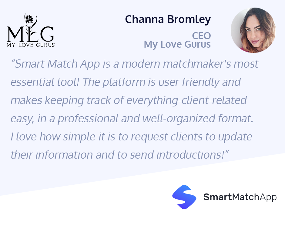"SmartMatchApp is a modern matchmaker's most essential tool! The platform is user friendly and makes keeping track of everything-client-related easy, in a professional and well-organized format. I love how simple it is to request clients to update their information and to send introductions! SmartMatchApp has an extremely efficient support team, always available to answer my questions, provide help in a timely fashion and friendly manner! Highly recommended for all matchmakers!!!"