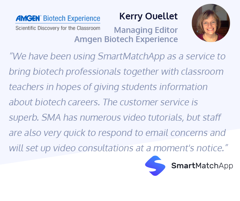 "We have been using SmartMatchApp as a service to bring biotech professionals together with classroom teachers in hopes of giving students information about biotech careers. This is a use of the platform that, to perfect, will need quite a bit of custom development over time, and the SmartMatchApp staff have been working hard to create exactly what we need. The customer service is superb. SMA has numerous video tutorials, but staff are also very quick to respond to email concerns and will set up video consultations at a moment's notice. I highly recommend giving them a try if you are looking for a platform to bring people together, whether it be socially or professionally. Thumbs up!"