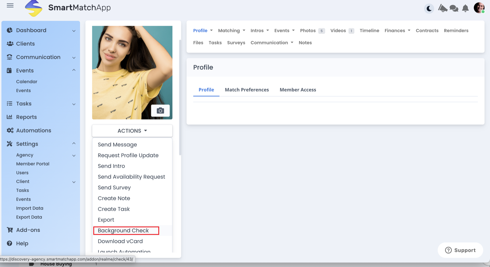 SImply go to the profile of your client, and click on ‘Actions’. Then choose the ‘Background Check’ from the dropdown.