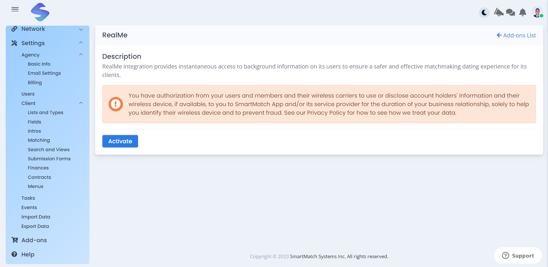 To activate the feature in SmartMatchApp, you should go to the Add-ons section and choose RealMe. Then simply select ‘Activate’ and your RealMe feature is now on!